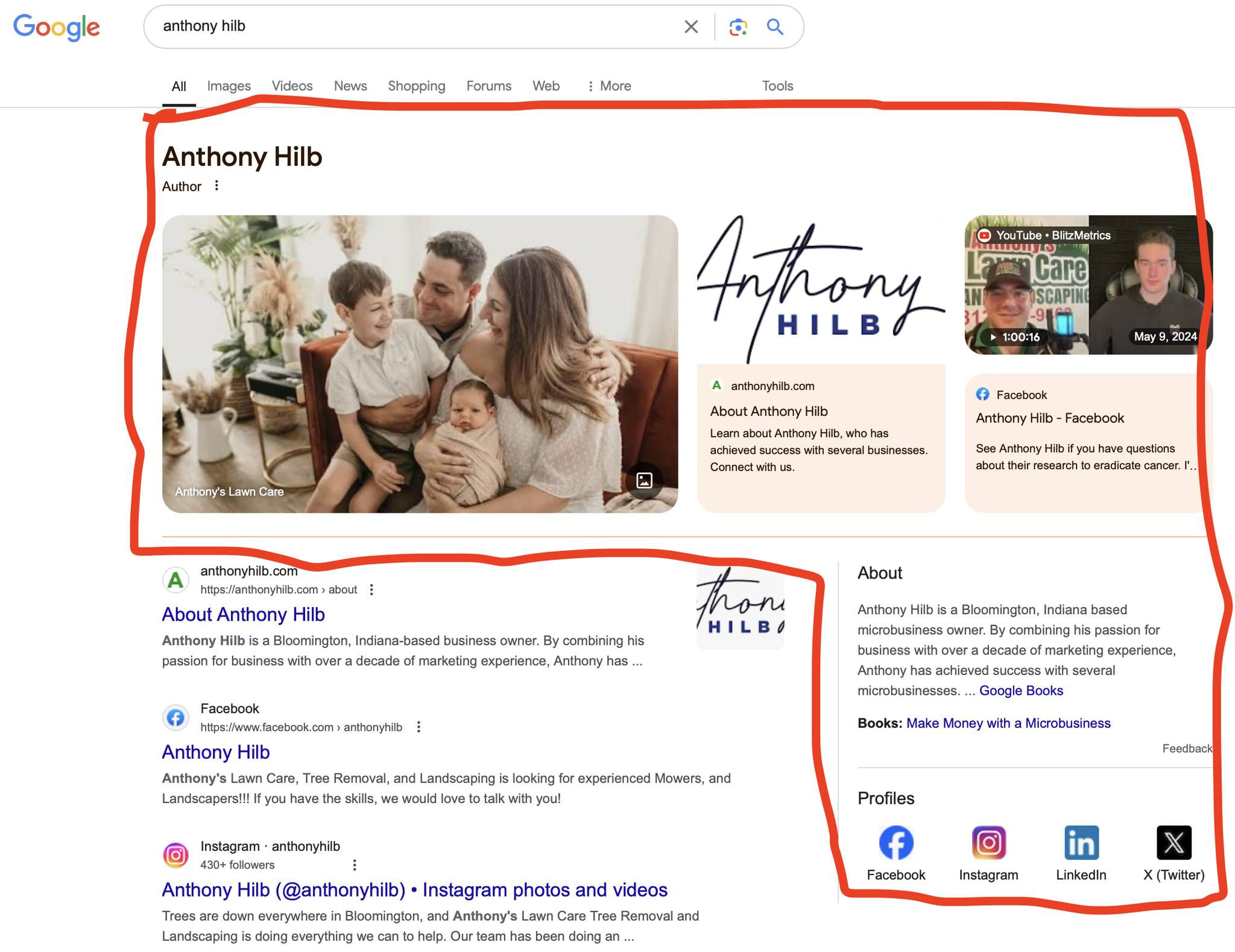 He’s not “famous”, but he’s organized and repurposed his content across multiple channels to send a consistent signal to Google.